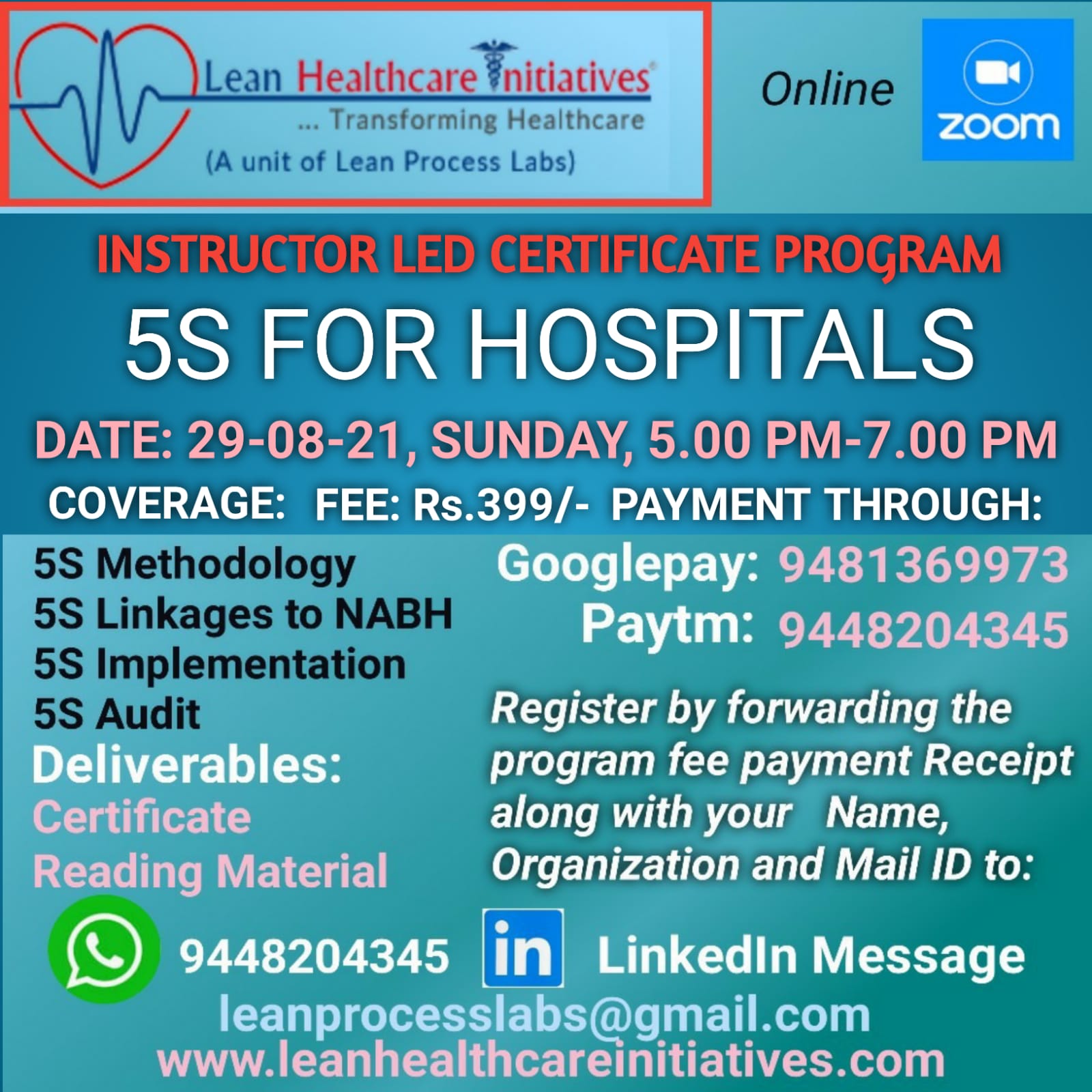 Healthcare Executives from Quality, Operations, Administration, and all other functional departments of a Healthcare Organization find this program very useful. This Program covers 1) Introduction to Lean Healthcare Management 2) 8 Wastes in Hospitals 3) 5S For Hospitals 4) Clinical Value Stream Mapping(VSM) 5) Healthcare Kaizen 6) Quick Change Overs(QCO) 7) KPI Improvement, under PSQ Module of NABH.